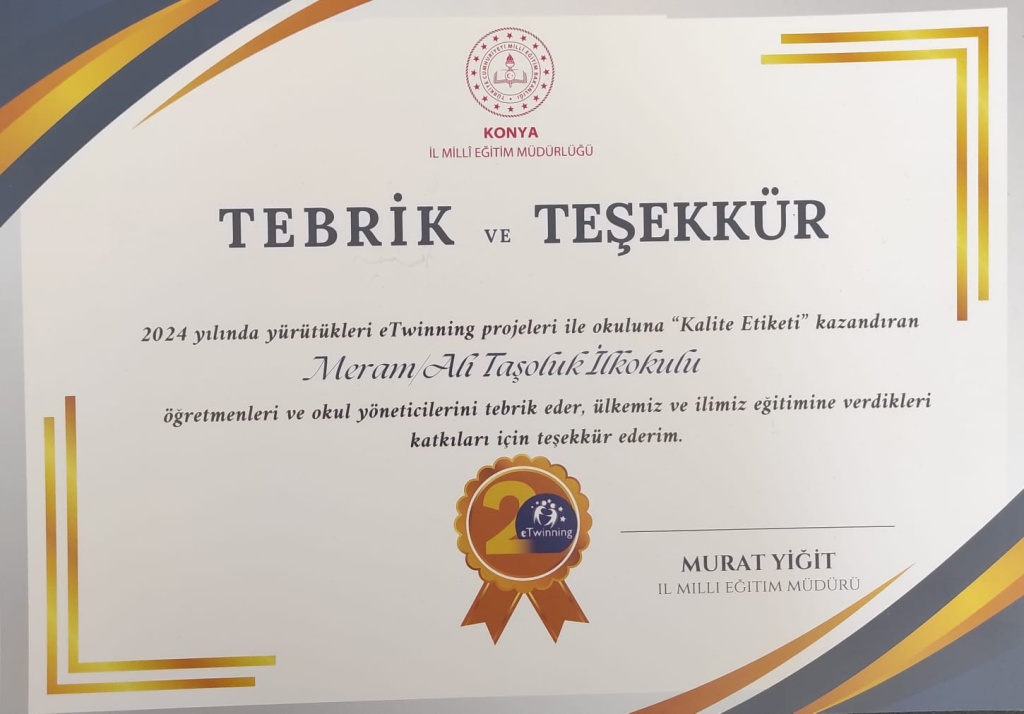 Okulumuzun 2024 yılı eTwinnning projelerinden kazandığı Kalite Etiketi nden dolayı İl Milli Eğitim Müdürümüz Murat YİĞİT okulumuza Tebrik ve Teşekkür Belgesi vermiştir.